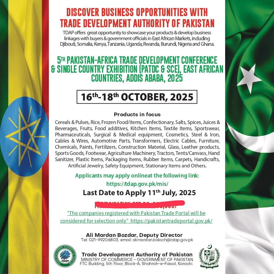 Join the 5th Pakistan–Africa Trade Development Conference & Exhibition from 16–18 October 2025 in Addis Ababa, Ethiopia. Organized by TDAP, the event connects Pakistani exporters with East African markets to showcase products and explore trade opportunities. Focus areas include food, textiles, medical equipment, construction materials, and more.